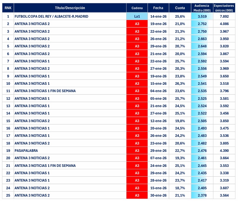 Atresmedia firma también un gran resultado en el ranking de emisiones más vistas en este mes de enero. De las 25 más vistas, logra contabilizar 24. Únicamente, se cuela entre estas emisiones una única, de La 1. El partido de Copa del Rey que enfrentó al Albacete y al Real Madrid, ha logrado ser la más vista con una cuota de pantalla de 25,6% y 3.519.000 espectadores.