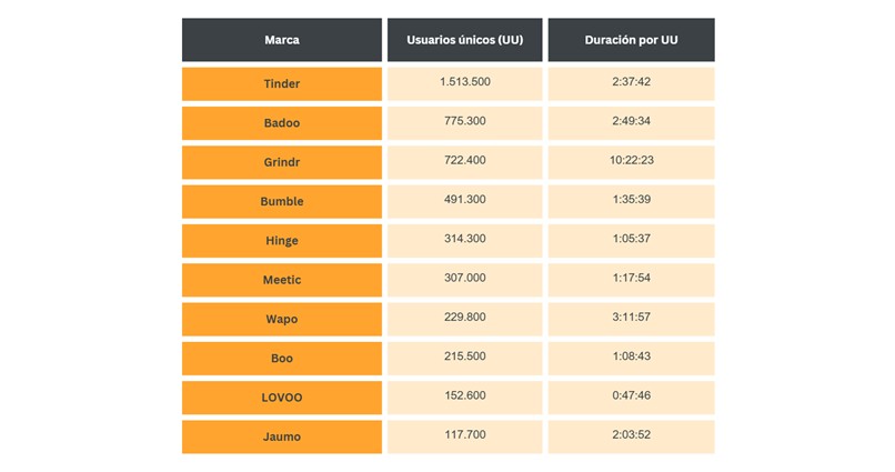No obstante, atendiendo al volumen de usuarios únicos mensuales, Tinder es la plataforma líder, con una audiencia mensual que supera el millón y medio de usuarios. Le siguen otras aplicaciones consolidadas en el mercado como Badoo, la ya mencionada Grindr y Bumble.