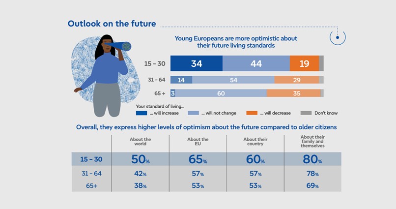 Desde un punto de vista sociodemográfico, los jóvenes siguen estando entre los partidarios más fervientes de la UE y tienen grandes expectativas respecto a su papel. La gente joven, de entre 15 y 30 años, tiende a opinar más favorablemente de la UE y el Parlamento que los ciudadanos de más edad: el 58 % tiene una imagen positiva de la UE (frente al 49-43 % entre los grupos de mayor edad) y el 68 % desea un papel más importante para el Parlamento Europeo (frente al 58-54 %). La juventud europea también es una firme defensora de: más unidad entre los Estados miembros en el contexto actual (90 %), más medios para la Unión Europea (78 %) y que la UE tenga más peso a nivel internacional (87 %).