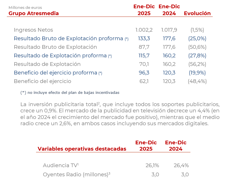 Atresmedia logra en el año 2025 unos ingresos netos de 1.002,2 millones de euros y un Resultado Bruto de Explotación (EBITDA) de 87,7 millones de euros. Sin el impacto de la provisión del plan de bajas incentivadas, el Resultado Bruto de Explotación alcanzaría los 133,3 millones de euros.