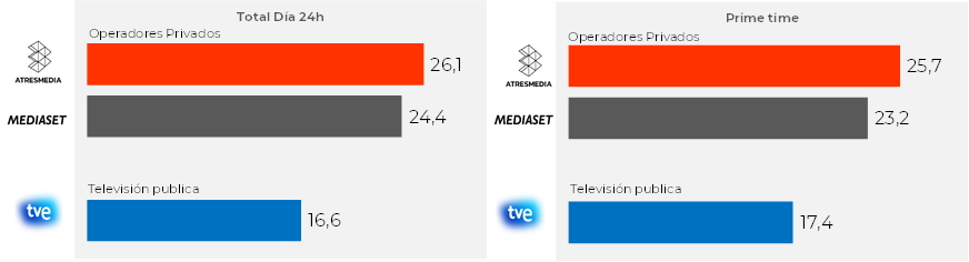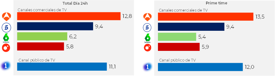 La inversión publicitaria total2, que incluye todos los soportes publicitarios, crece un 0,9%. El mercado de la publicidad en televisión decrece un 4,4% (en el año 2024 el crecimiento del mercado fue positivo), mientras que el medio radio crece un 2,6%, en ambos casos incluyendo sus mercados digitales.