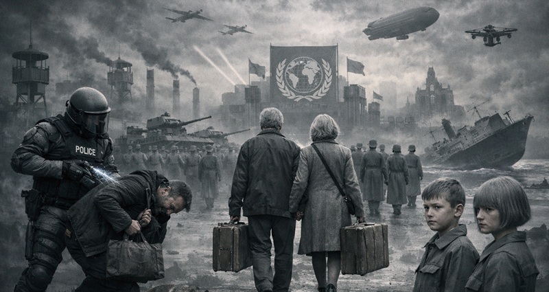 Bellum Orbis Terrarum II viximus; alia bella in historia memorata eadem erant, sed cum pausa ad arma ‘rearmanda’ et nova arma et tormenta in solo Iberico probanda. Paucis abhinc annis, idea “Novi Ordinis Mundi” (NOM) emersit — vocabulum a memorabili Chiquito de la Calzada, stratego risus et anima perdita flamenci, creatum. Cum H? Minime, id foramen est. Bene, NOM vult nos omnes eandem uniformem cineream gerere, capillos nostros cinereos tondere, et ad mundum nigrum, album, et cinereum migrare… Omnia cinerea, praeter vestes vigilum, cinerea vel cinereo-caerulea sunt, ut dicerent in terra sancocho.