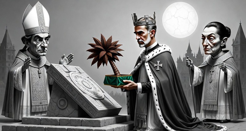 Y en medio de este teatro grotesco aparece, cómo no, la figura del rey. No como monarca medieval, sino como consumidor ideal. El mismo que reconoce “abusos” en la conquista de México, como si la historia pudiera reducirse a una nota diplomática con tono de disculpa tibia. Resulta tentador imaginar en Chueca, observando la caja de la palmera con gesto grave, como si dentro no hubiera hojaldre sino una reparación simbólica de siglos. Porque si hubo sacrificios en Tenochtitlán, también los hubo —de otra naturaleza— en la llegada de Cortés y sus 500 hombres, convertidos ahora en cifra incómoda, en argumento político, en moneda de cambio discursiva.