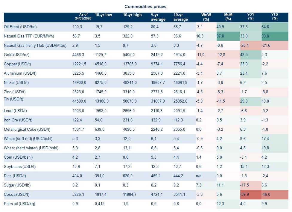 Según los economistas de Coface, líder en gestión de riesgos comerciales, los recientes ataques al complejo gasístico de Ras Laffan, en Catar, han provocado una nueva subida del precio de las materias primas energéticas. El crudo Brent, que alcanzó un máximo de 119 dólares a mediados de marzo, subió un 50 % en un mes.