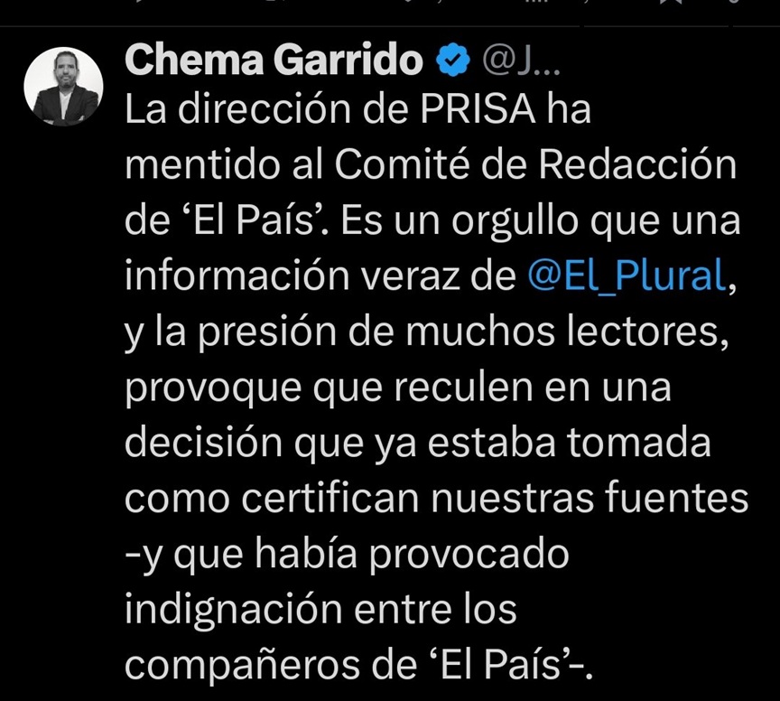 Desde El Plural, diario que ofreció en exclusiva la información de la retirada de la querella, aseguran que “la dirección de Prisa ha mentido a su comité de redacción”. Mantienen la información ofrecida, aunque, Chema Garrido, director de El Plural precisa que desde El País “han reculado” tras la publicación de su noticia.