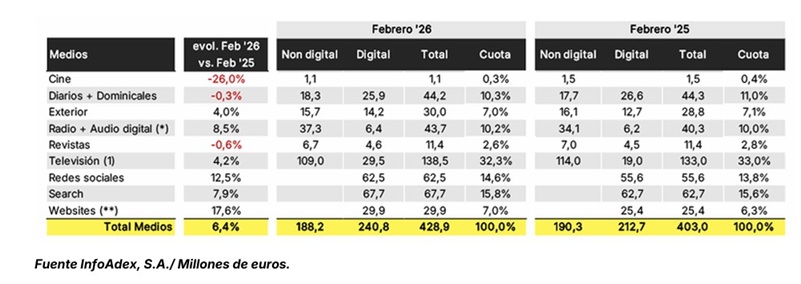 La inversión publicitaria en España ha registrado una evolución positiva durante el mes de febrero de 2026 traducida en un crecimiento del 6,4% hasta alcanzar los 428,9 millones de euros. Un crecimiento que consolida la tendencia de crecimiento moderado iniciada a comienzos de año, según las estimaciones de InfoAdex.