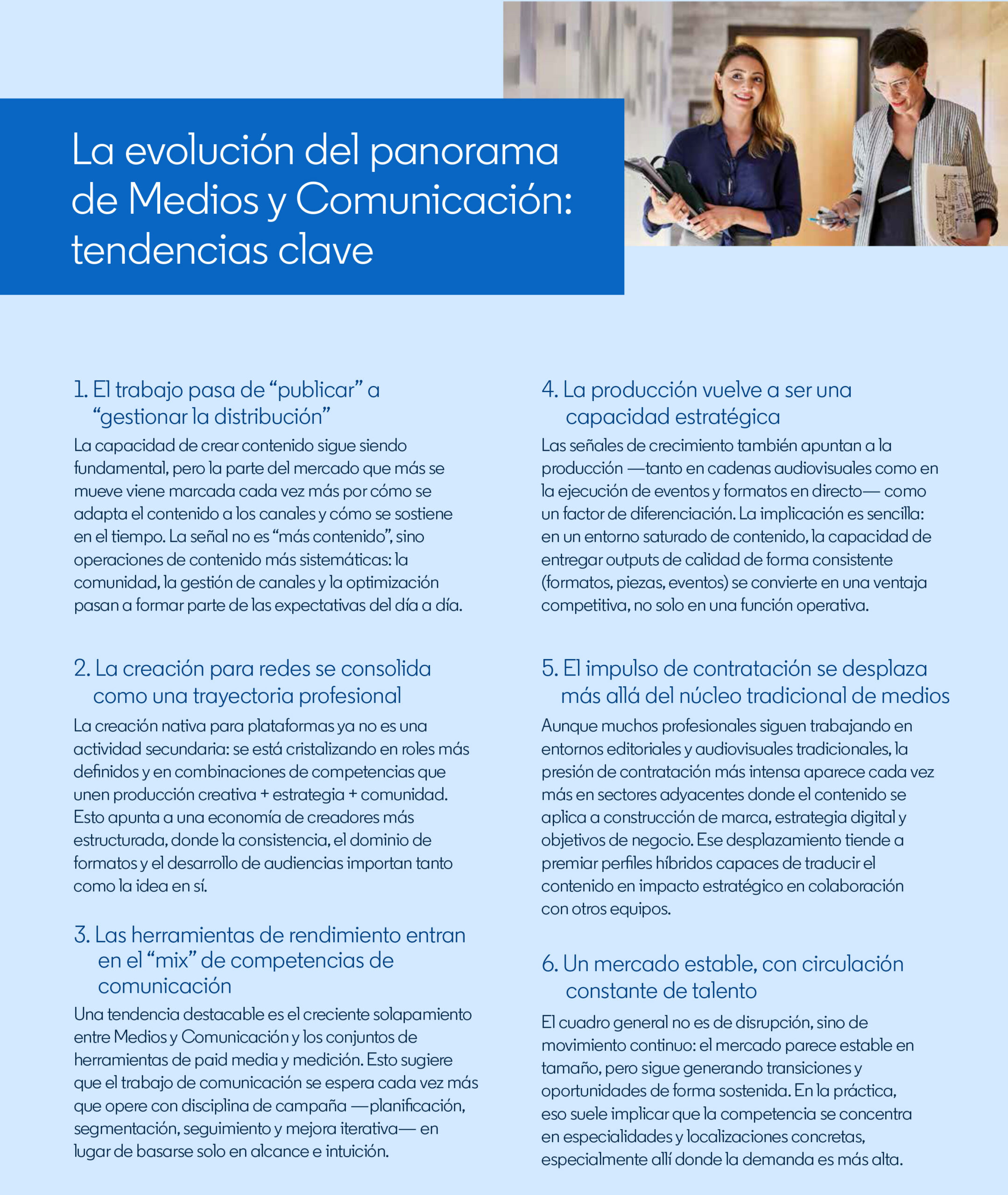 Lo vemos, sobre todo, como una plataforma capaz de aportar visibilidad, contexto y oportunidades. Y este informe es una buena prueba de ello, porque es el primer análisis propio de LinkedIn centrado en el talento de Medios, Comunicación y Periodismo en España y ofrece una radiografía muy clara de hacia dónde está evolucionando el mercado: más distribución, más formatos audiovisuales, más analítica, más perfiles híbridos y más oportunidades fuera del núcleo tradicional de medios. Nuestra ambición es acompañar esa evolución ayudando a los profesionales a entender mejor el mercado, reforzar su posicionamiento y conectar con nuevas oportunidades en un ecosistema cada vez más transversal.