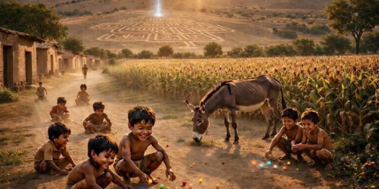 En una calle polvorienta de un pueblo sin nombre, unos niños juegan a las canicas.