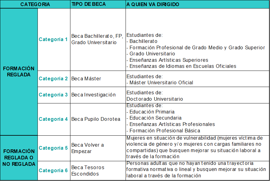 El Proyecto Dorotea se articulará a través de la concesión de 6 tipos de becas. Cuatro de ellas orientadas a formación reglada, desde educación primaria, secundaria y Formación Profesional hasta estudios universitarios, máster o doctorado, con el objetivo de impulsar trayectorias académicas sólidas y alineadas con el desarrollo profesional de las personas beneficiarias.