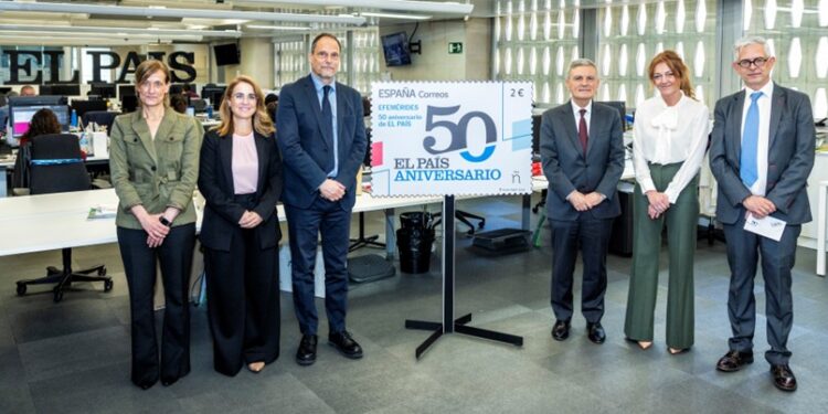 Correos ha presentado este 16 de abril, en la redacción de EL PAÍS en Madrid, el sello conmemorativo del 50º aniversario del diario. La emisión, dentro de la serie Efemérides, con una tirada de 65.000 ejemplares y un valor postal de 2 euros, se cerró con un matasellado de honor. El sello ya está disponible en oficinas de Correos, en Correos Market y a través del Servicio Filatélico.