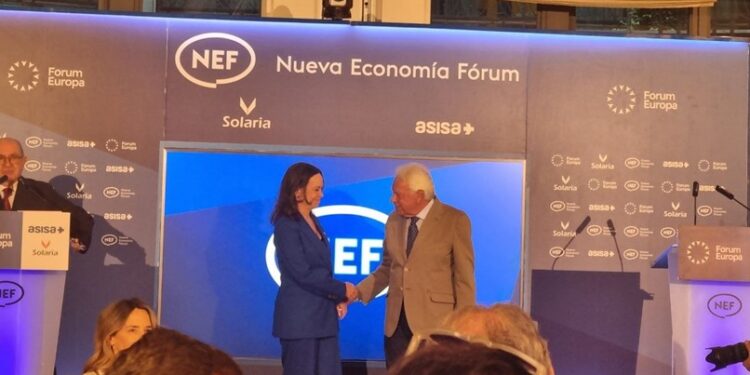 En el desayuno informativo, organizado por Nueva Economía Fórum, se mostró agradecida por la acogida recibida en la capital tanto por parte del Ayuntamiento de Madrid como de la Presidencia de la Comunidad, así como de la diáspora venezolana en España, que abarrotó la Puerta del Sol el pasado sábado para aclamarla. Acompañada por personalidades españolas del ámbito empresarial, social y político, a su izquierda, contó con el respaldo del presidente del Partido Popular, Alberto Núñez Feijóo, y a la izquierda de este, con el del alcalde de Madrid, José Luis Martínez-Almeida. Todos la aplaudieron de pie. También los políticos, académicos y personalidades venezolanas que asistieron al evento.