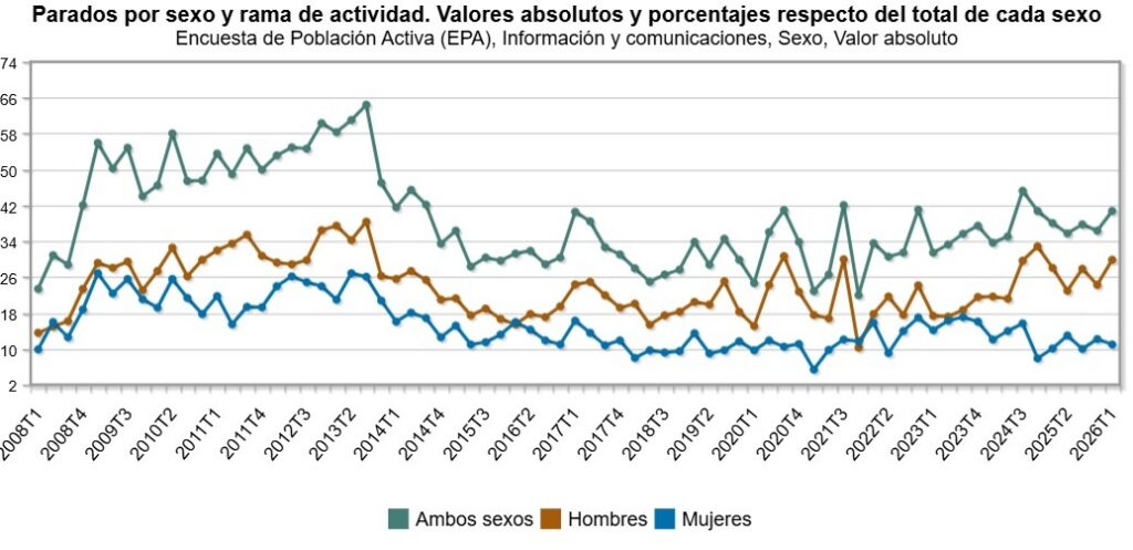 Si nos centramos en el sector de la información y la comunicación, las cifras no son mucho más optimistas. La tasa de paro crece un 12,1% en el último trimestre, después de que los parados se cuenten en 40.700, 4.400 más que en el último trimestre de 2025.